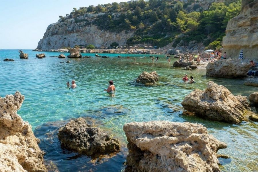 The bay is naturally protected from the wind, so the water stays calm—unlike some of the wilder beaches on Rhodes. Stone paths make it easy to get around.