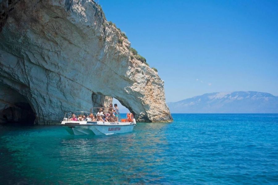 You’ll only reach the beach by boat—there’s no road down to the cove. Most tours leave from Porto Vromi or Zakynthos Town.