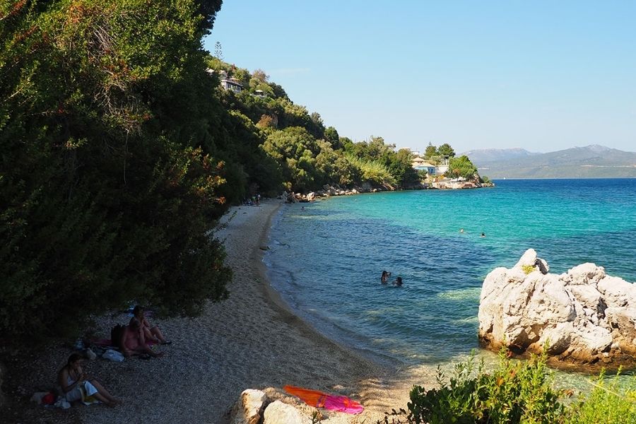 Desimi beach sits a short drive north of Nidri. It’s smaller and more secluded—ideal if you’re looking for a quieter scene.