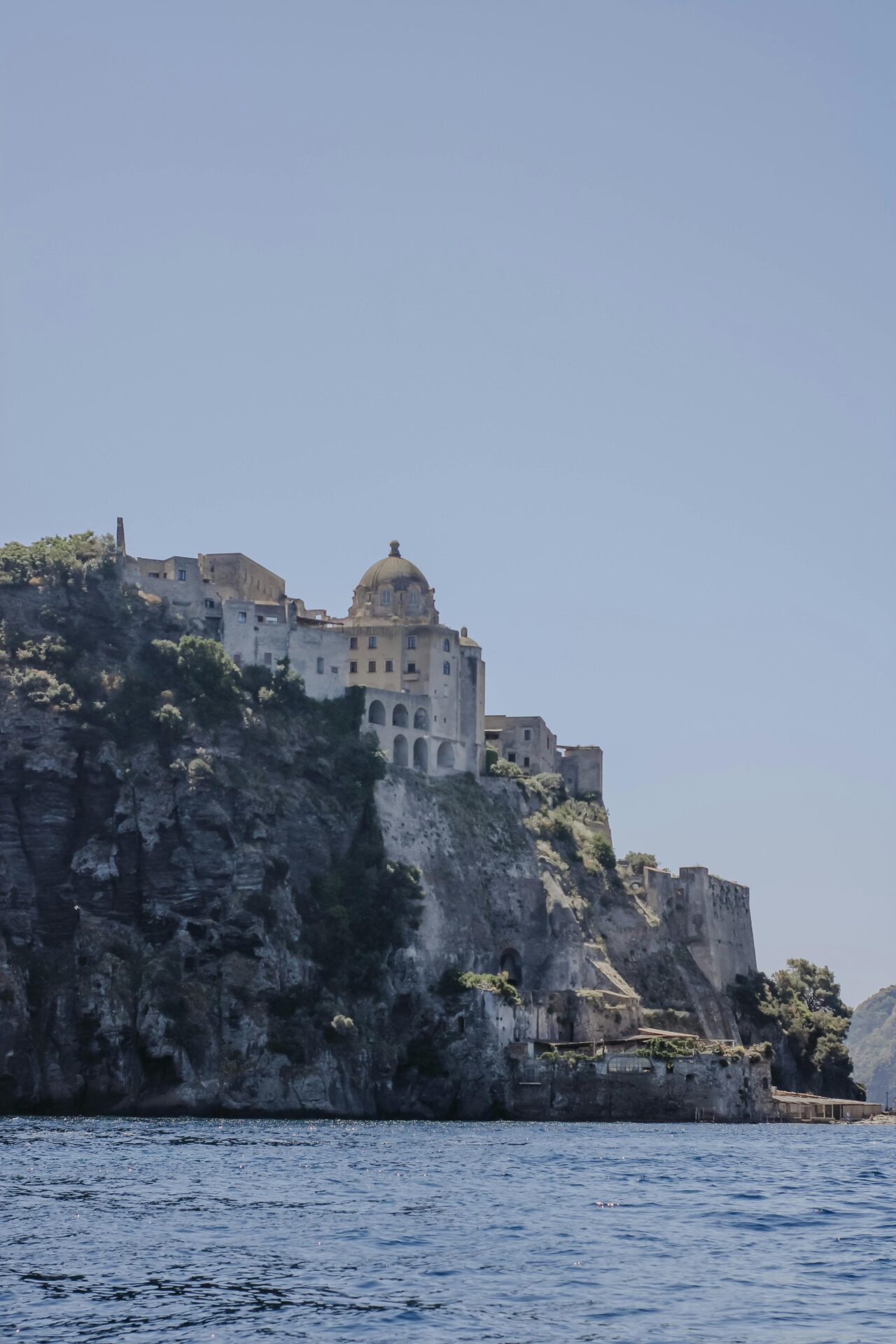 Distant daytime view of the Aragonese Castle rising from the coastline, surrounded by blue sea and set against a clear sky.